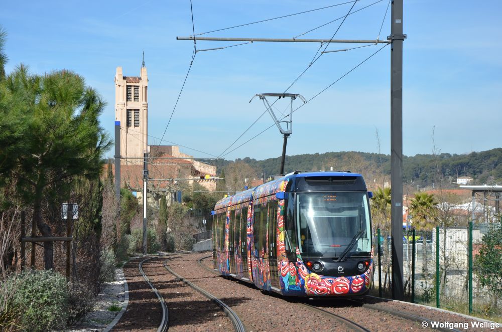 Die Stadt Aubagne liegt in Südfrankreich, ca. 15 Kilometer östlich von Marseille und hat knapp 50.000 Einwohner. Sie verfügt seit September 2014 über eine etwa drei Kilometer kurze Straßenbahnlinie, die den Bahnhof mit den Wohnvierteln im Westen der Stadt verbindet. Die Bahn verkehrt montags bis samstags alle 10 Minuten, an Sonntagen ruht der Betrieb. Die Nutzung der Tram ist ebenso wie die Stadtbusse kostenlos. Das außergewöhnliche Design der Bahnen mit seinen Comic-Zyklopen wurde vom Künstler Hervé Di Rosa gemeinsam mit Schülern aus Aubagne entworfen. Sie wird im Auftrag des regionalen Aufgabenträgers → Lignes de l’Agglo von der RTM betrieben, die auch die öffentlichen Verkehrsmittel in Marseille verantwortet.