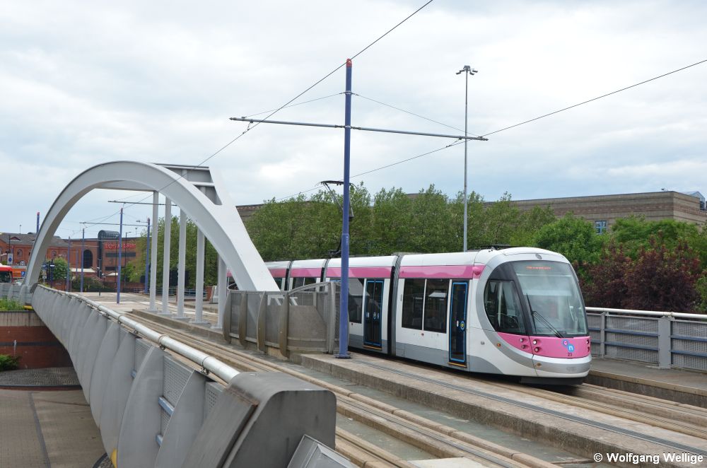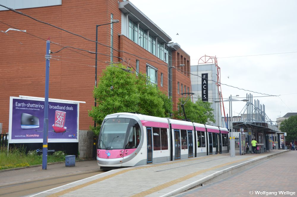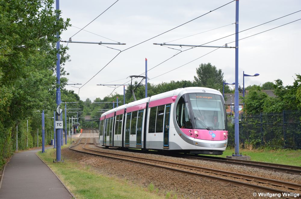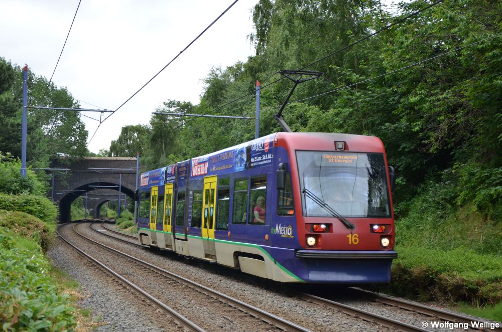 Die 'West Midlands Metro' wird mit Fahrzeugen des Typs Urbos 3 vom spanischen Hersteller CAF betrieben - Nummer 29 hat am 02.07.2015 gerade die Haltestelle Priestfield verlassen und fährt gleich in den straßenbündig trassierten Abschnitt in Wolverhampton ein.