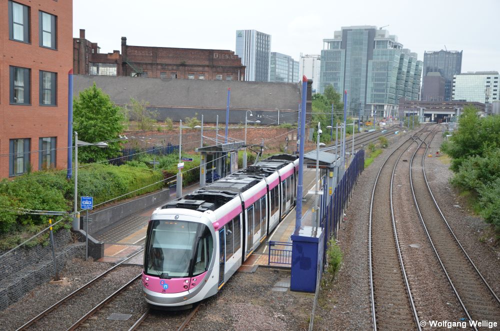 Die ersten Kilometer hinter dem Bahnhof Snow Hill verläuft die 'West Midlands Metro' parallel zu den Bahngleisen der British Rail. Auf diesem Streckenabschnitt liegt die Haltestelle St Paul's, die Wagen 26 gerade verlässt. (02.07.2015)