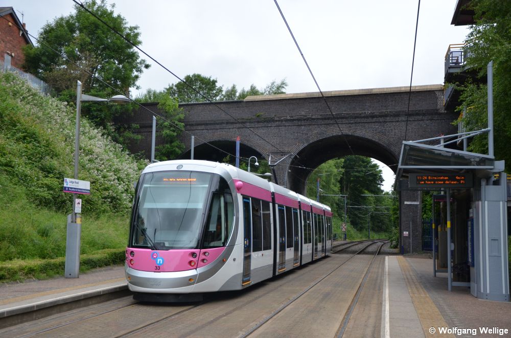 Deutlich erkennt man an der Station Lodge Road, dass die Midland Metro größtenteils auf einer ehemaligen Eisenbahntrasse verläuft. Am 2. Juli 2015 Wagen 33 auf dem Weg nach Wolverhampton gerade einen kurzen Stopp an dieser Haltestelle ein.