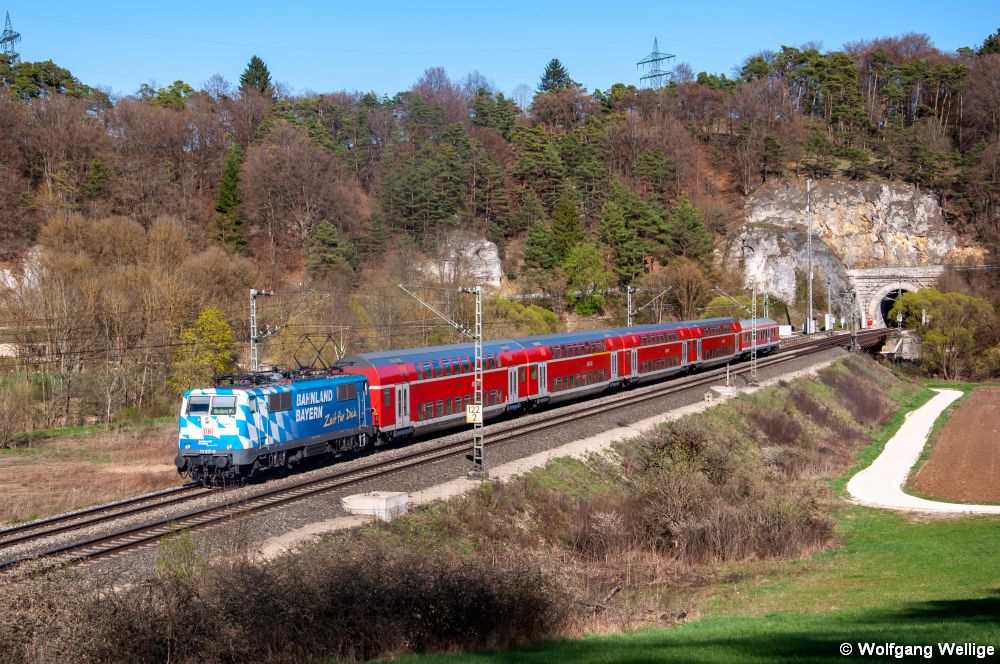 Die mit einer Werbebeklebung für das 'Bahnland Bayern' versehene 111 017 hat am 9. April 2011 auf dem Weg von München nach Nürnberg gerade den Esslingerbergtunnel zwischen Dollnstein und Solnhofen im Altmühltal verlassen