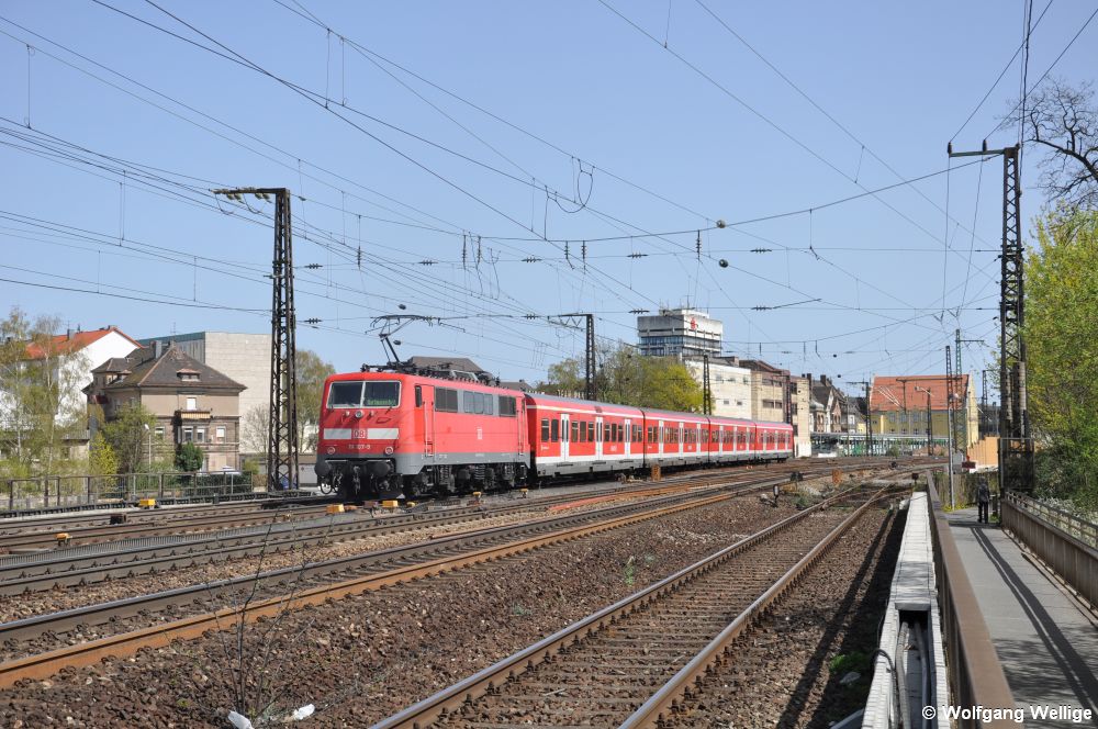 Wegen Problemen mit den für die Nürnberger S-Bahn bestimmten Triebwagen 'Talent 2' durfte die Baureihe 111 im Jahre 2011 vorübergehend S-Bahndienste in Nürnberg erbringen, hier rollt 111 107 am 10. April 2011 mit einer Garnitur 'x-Wagen' als S1 (Bamberg - Hartmannshof) durch Fürth.