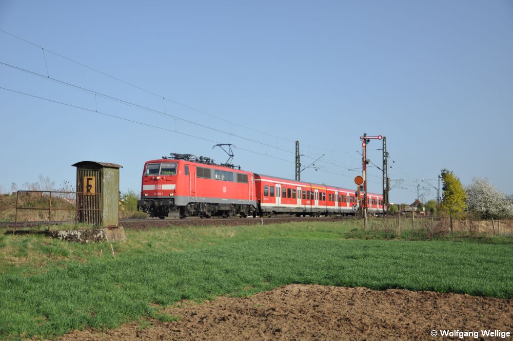 111 205 hat am 10. April 2011 mit einem S-Bahnzug der Linie S1 (Hartmannshof - Nürnberg - Bamberg) gerade den zu dieser Zeit noch mit Formsignalen ausgestatteten Bahnhof Hirschaid verlassen
