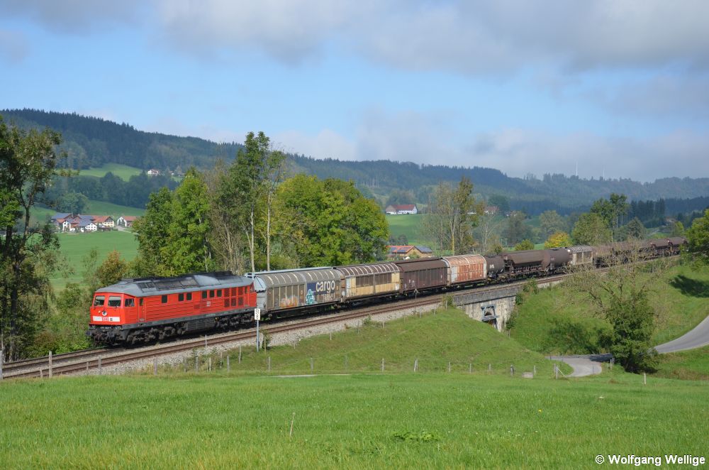 233 285 dieselt am 4. Oktober 2014 zwischen Günzach und Kempten mit einem Güterzug Richtung München durch das Allgäu