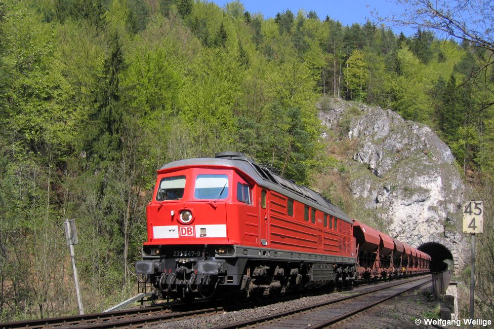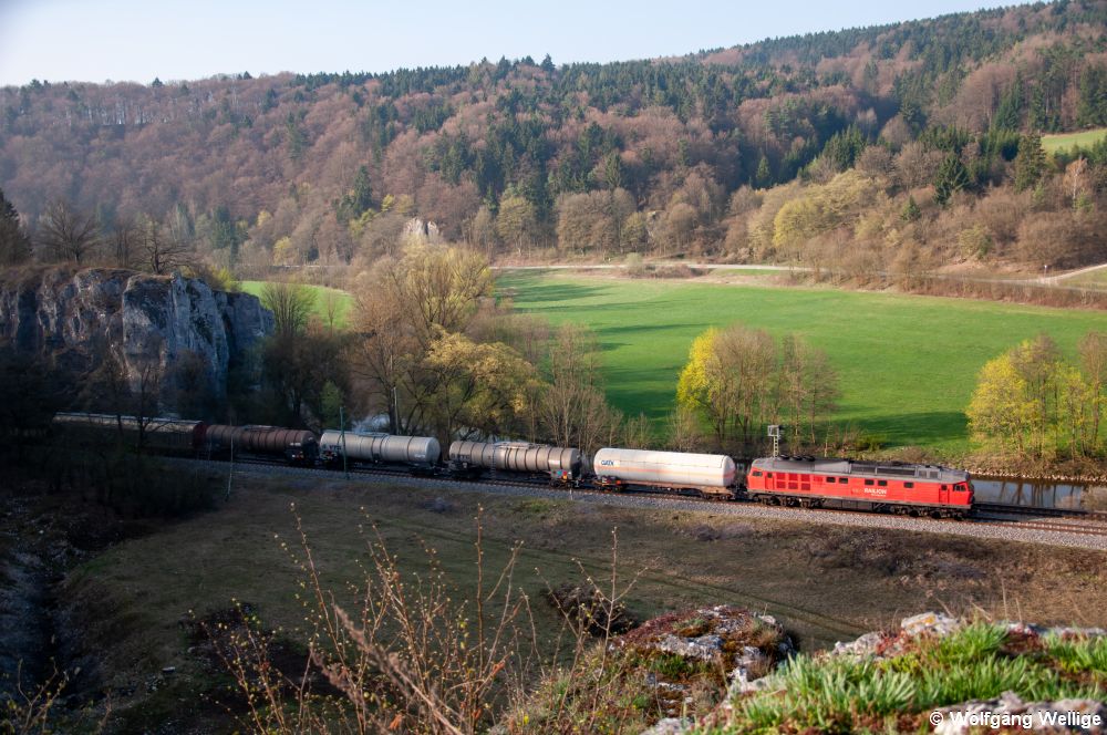 232 636 dröhnt am Morgen des 9. April 2011 mit einem Güterzug Richtung Treuchtlingen bei Dollnstein durch das Altmühltal.
