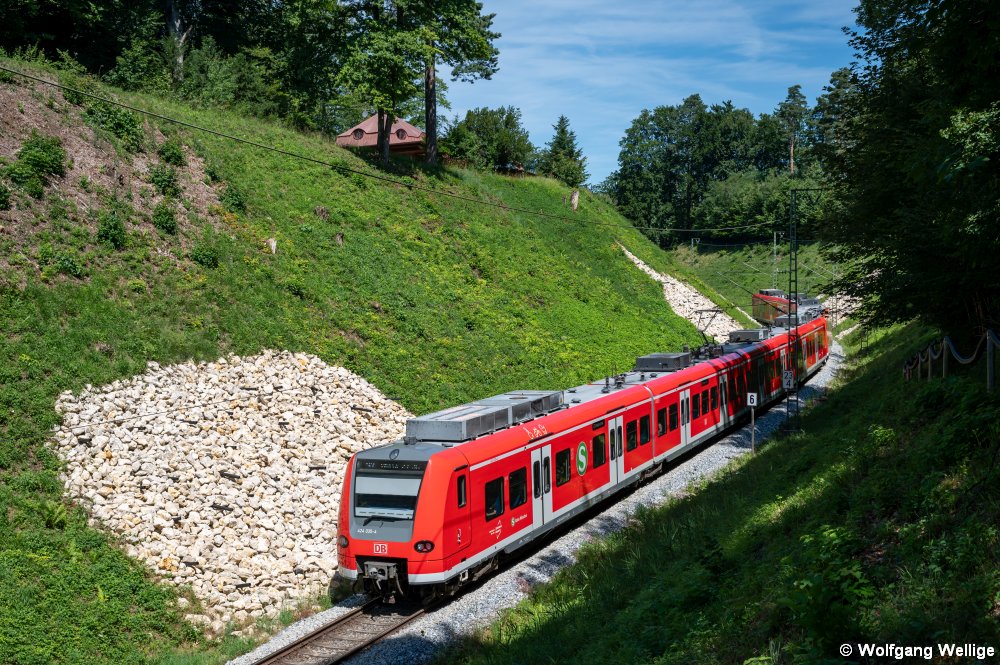 Der aus Hannover übernommene und 'aufgehübschte' 424 022 der S-Bahn München rollt am 19.07.2025 hinter Icking hinab ins Isartal nach Wolfratshausen