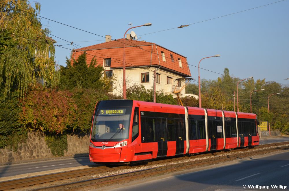 Der Skoda 30T Nummer 7503 fährt am späten Nachmittag des 31.10.2015 als Linie 5 auf die Haltestelle Molecova zu