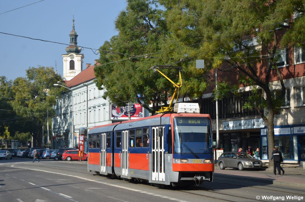 Der Tatra-K2 Wagen Nummer 7120 erreicht am 31. Oktober 2015 gleich die Haltestelle Námestie SNP (Slovenského národného povstania, zu deutsch: Platz des slowakischen Nationalaufstandes)
