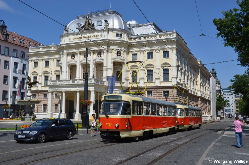 Der Tatra T3 Nummer 7763 fährt am 22. Juli 2012 als Linie 9 vor dem slowakischen Nationaltheater kurz hinter der Haltestelle Jesenského entlang