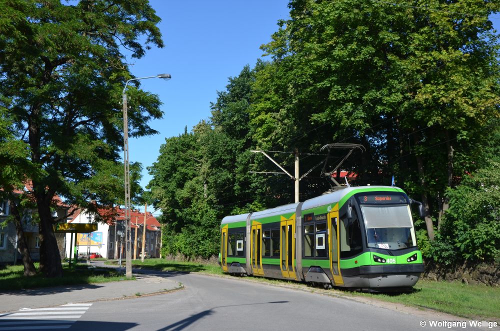 Idyllisch im Grünen liegt die Haltestelle Obrońców Pokoju (Wiejska), an der Wagen 405 am 6. Juli 2017 gerade auf dem Weg ins Stadtzentrum hält.