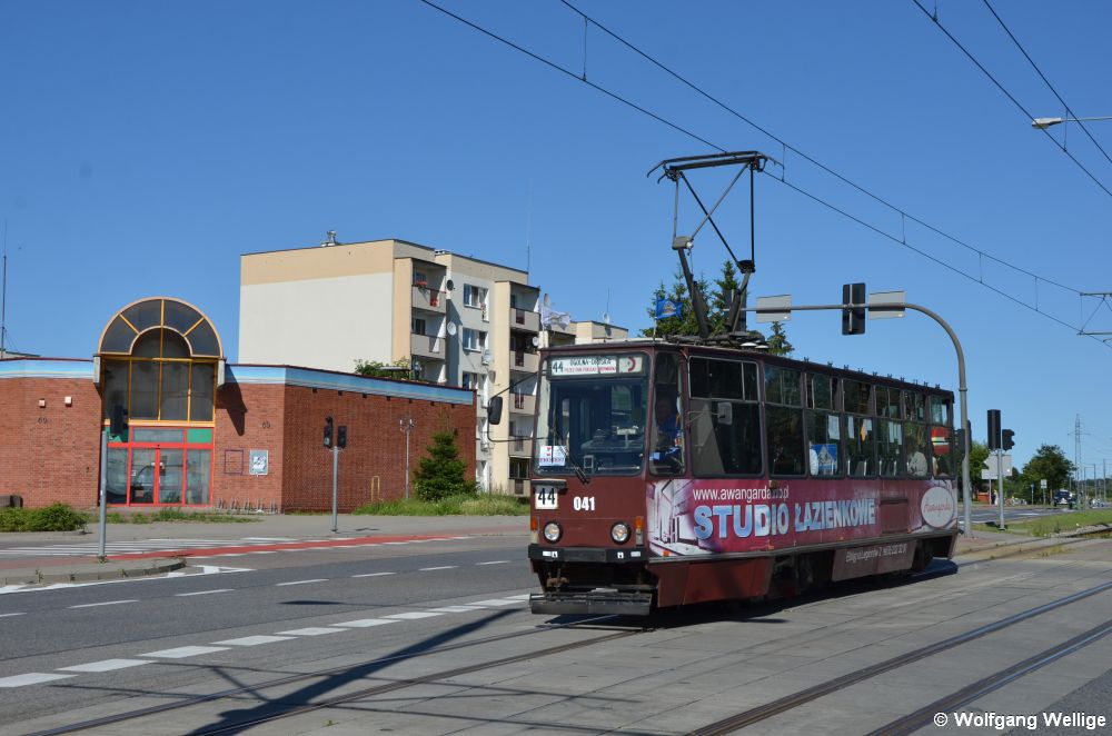 Wagen 041 fährt auf die in einer Plattenbausiedlung gelegene Haltestelle Ogólna (Broniewskiego) zu (06.07.2017)