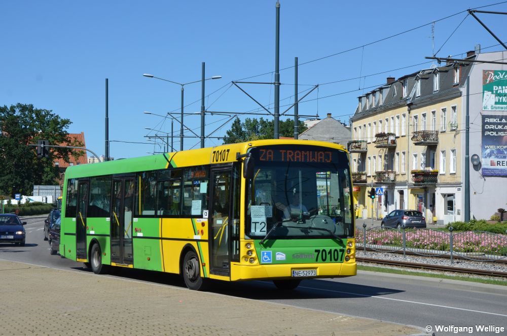 Wagen 810 ist der im Jahre 2015 gebraucht aus Augsburg übernommene, 1985 von MAN gebaute M8C Nummer 8010, der zuvor von Modertrans einen neuen Kopf und ein Niederflur-Mittelteil erhalten hat. Am 6. Juli 2017 durchfährt er gerade den Kreisverkehr nahe der Haltestelle Browarna (Zielone Tarasy).