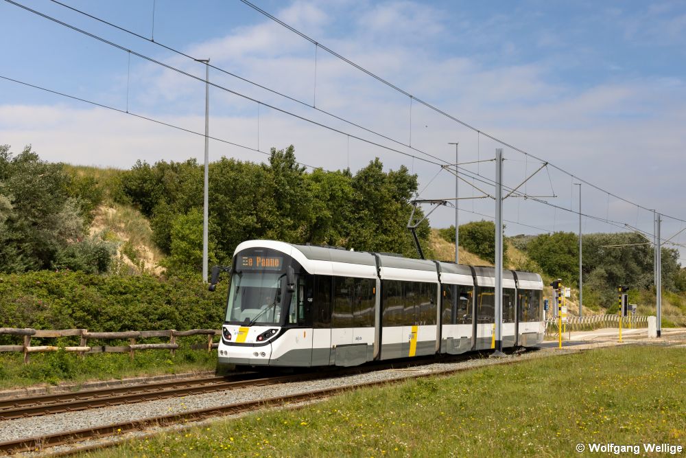 Hinter den durchaus beachtlich hohen Dünen liegt die Haltestelle 'De Haan Zwarte Kiezel', die Wagen 6135 am 21.06.2022 gerade hinter sich gelassen hat.