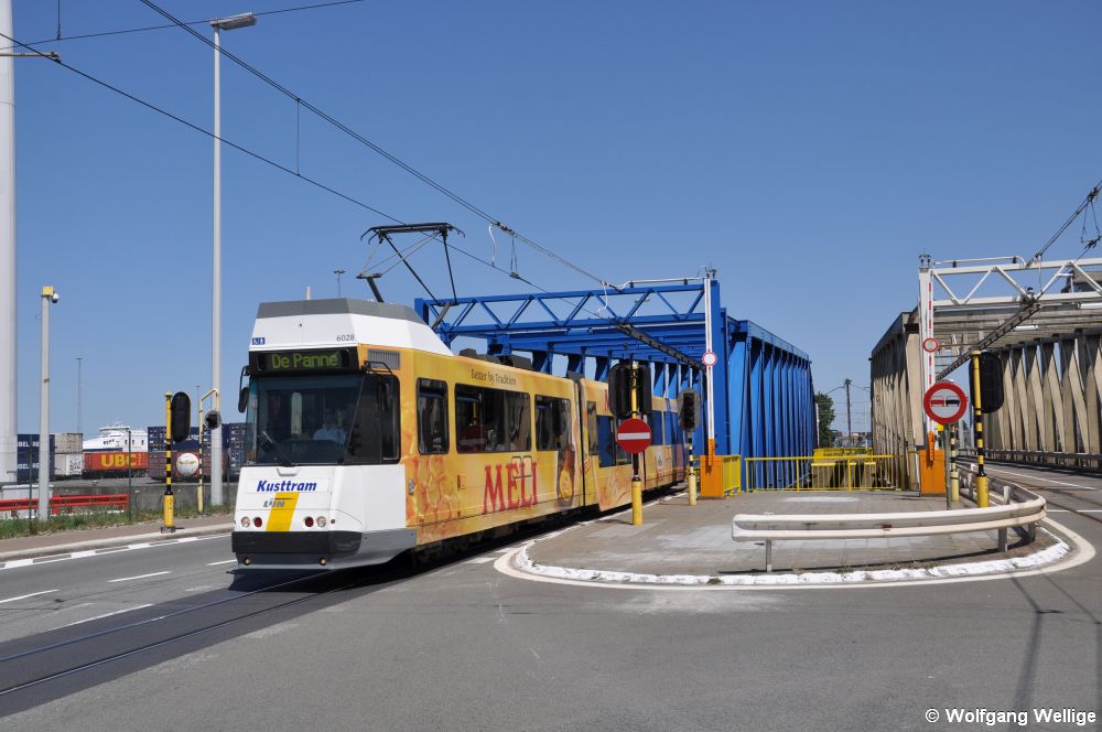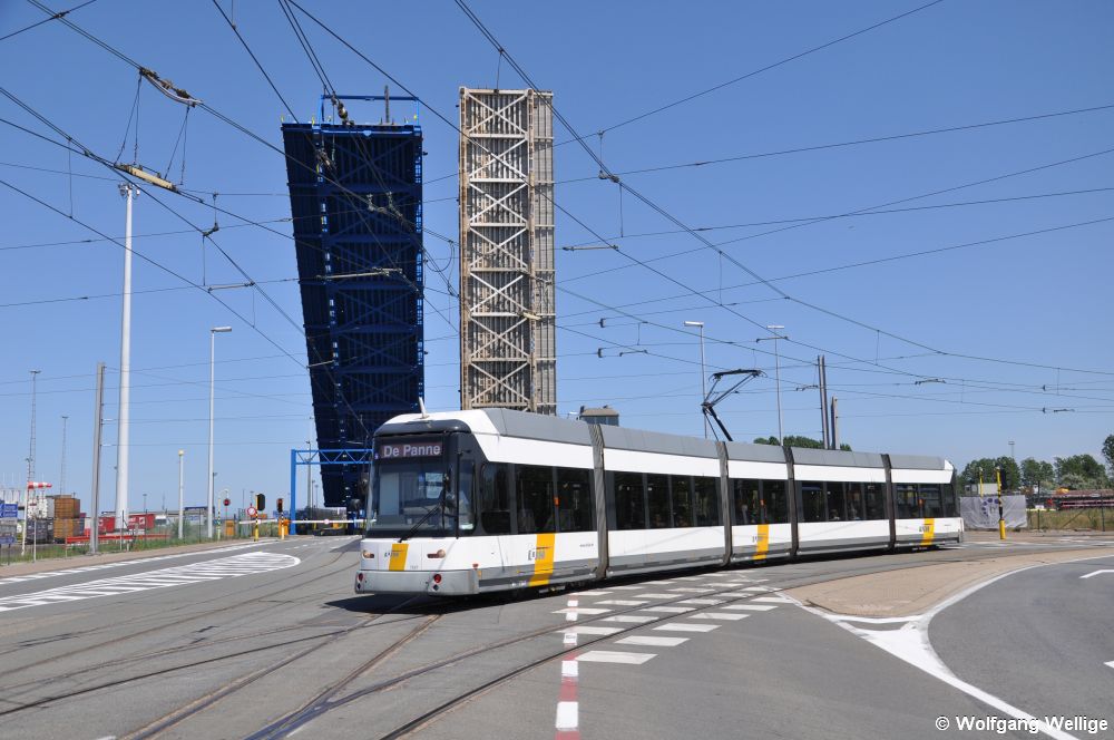 Wagen 7267, ein Fahrzeug des ab 1999 von De Lijn beschafften Typ 'HermeLijn' von Siemens und Bombardier, kommt am 1.6.2011 in Zeebrugge Zeesluis von der Umleitungsstrecke. Diese wird nur bei geöffneter Klappbrücke befahren, da das Abwarten der Öffnungszeit den Betrieb zu sehr verzögern würde. Der linke Brückenteil senkt sich aber bereits wieder.
