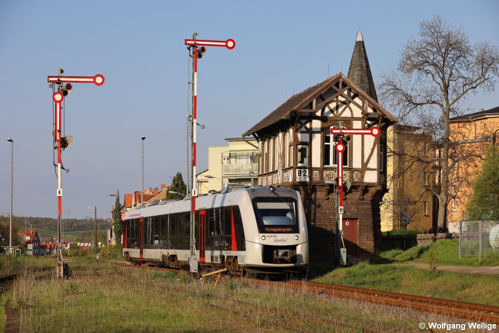 1648 402 der Abellio Rail Mitteldeutschland passiert am 2. Mai 2023 als RE 11 von Magdeburg kommend das wunderschöne Fachwerk-Stellwerk des Endbahnhofs Thale mit seinen noch vorhandenen Formsignalen in drei unterschiedlichen Höhen