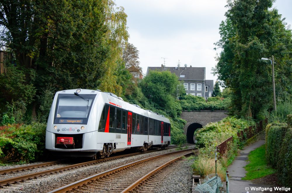 Seit Ende 2013 wird die Regionalbahn Wuppertal-Remscheid-Solingen als S-Bahnlinie S 7 bezeichnet, obwohl hier nur zweiteilige LINT-Dieseltriebwagen verkehren. Am 11.10.2016 hat VT 1212 05 gerade den 62 Meter langen Weyersberger Tunnel bei Solingen Grünewald durchfahren.