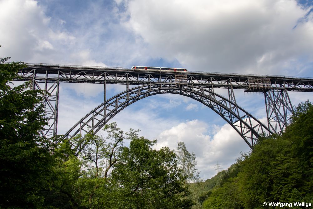 Ein LINT-Triebwagen der seit 2022 insoventen Abellio Rail NRW überquert am 12.06.2021 die Müngstener Brücke, Deutschlands höchste Eisenbahnbrücke, bei Solingen-Schaberg.