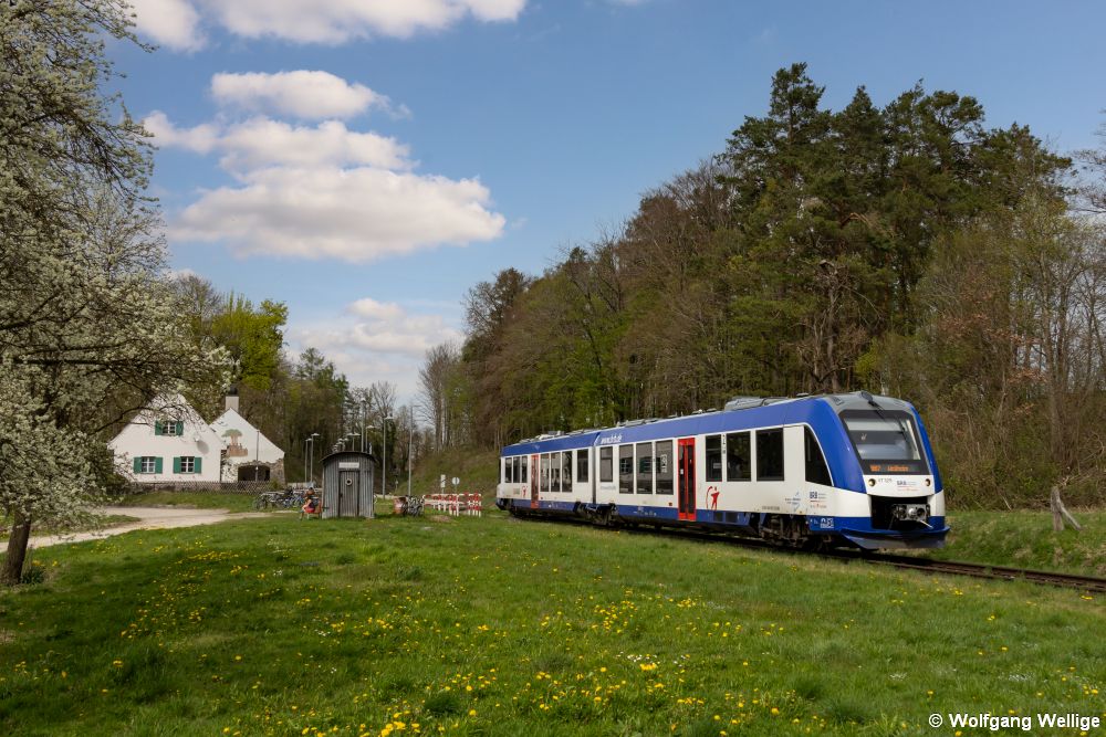 In frühlingshafter Umgebung hat VT 324 der Bayerischen Regiobahn am 7. April 2024 gerade den Haltepunkt St. Ottilien verlassen