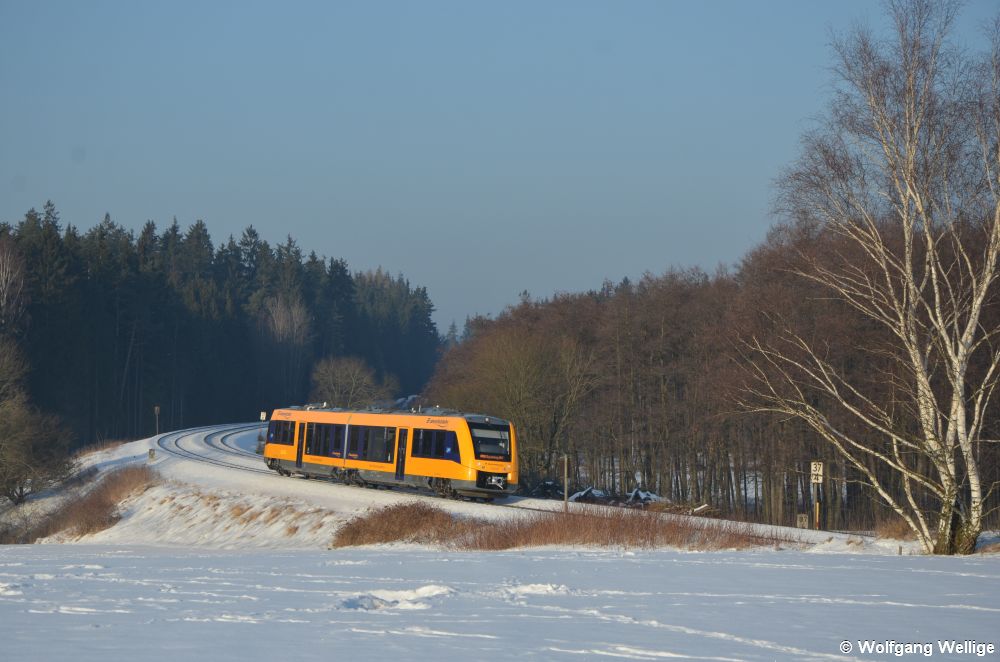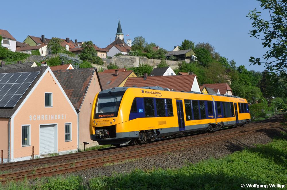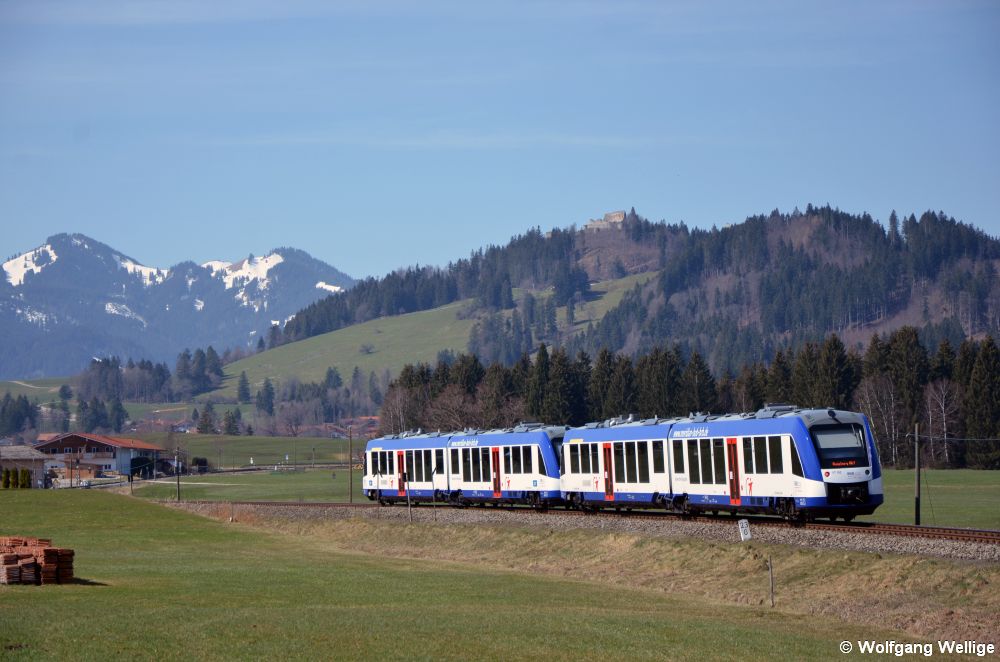 Im Dezember 2018 übernahm die Bayerische Regiobahn (BRB) von der DB den Gesamtverkehr auf der so genannten 'König-Ludwig-Bahn' nach Füssen. Am Morgen des 30. März 2019 fährt VT 162 bei Weizern-Hopferau als BRB 62774 von Füssen nach Augsburg, im Hintergrund ist die Burgruine Eisenberg zu sehen.