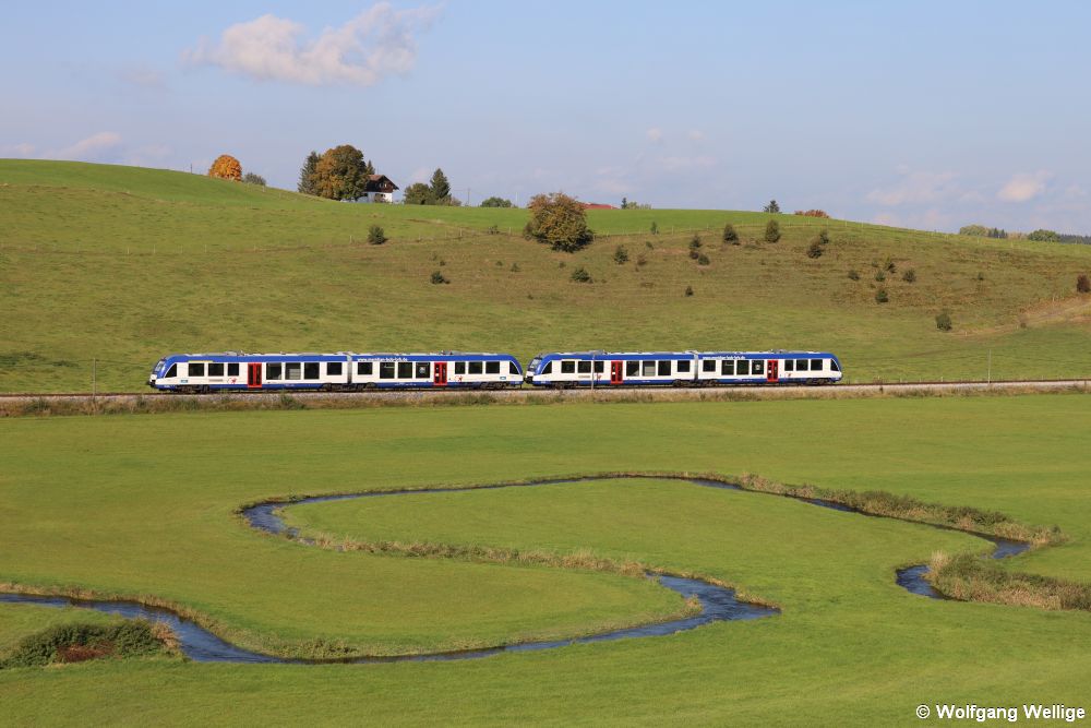 An einem nicht gerade zielgerichteten Bachlauf bei Lengenwang dieselt VT 161 der Bayerischen Regiobahn am 19. Oktober 2020 auf dem Weg von Füssen nach Augsburg entlang (BRB 62774)