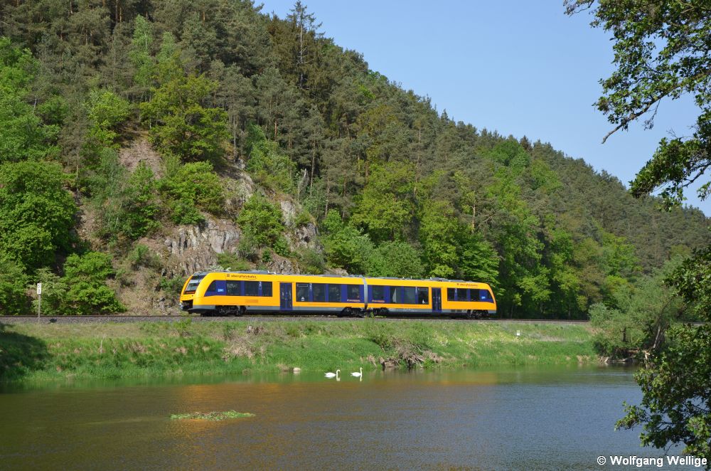Während ein Schwanenpärchen auf dem Fluss Naab bei Pfreimd die Frühlingssonne genießt, saust ein wenig höher LINT-Triebwagen 1648 211 der Oberpfalzbahn am 5. Mai 2018 als Zug OPB 79718 von Regensburg nach Marktredwitz entlang.