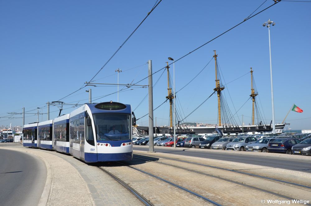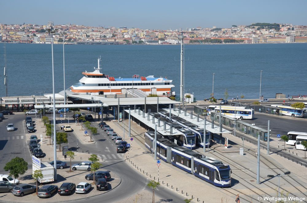 Wagen C022 verlässt die direkt am Schiffsanleger gelegene Endhaltestelle Cacilhas, wo zu den Fähren nach Lissabon umgestiegen werden kann (15.09.2012).