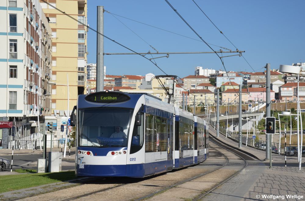 'Combino Plus' C012 erreicht als Linie 1 Richtung Cacilhas am 15.09.2012 die Haltestelle Cova da Piedade im Zentrum von Almada