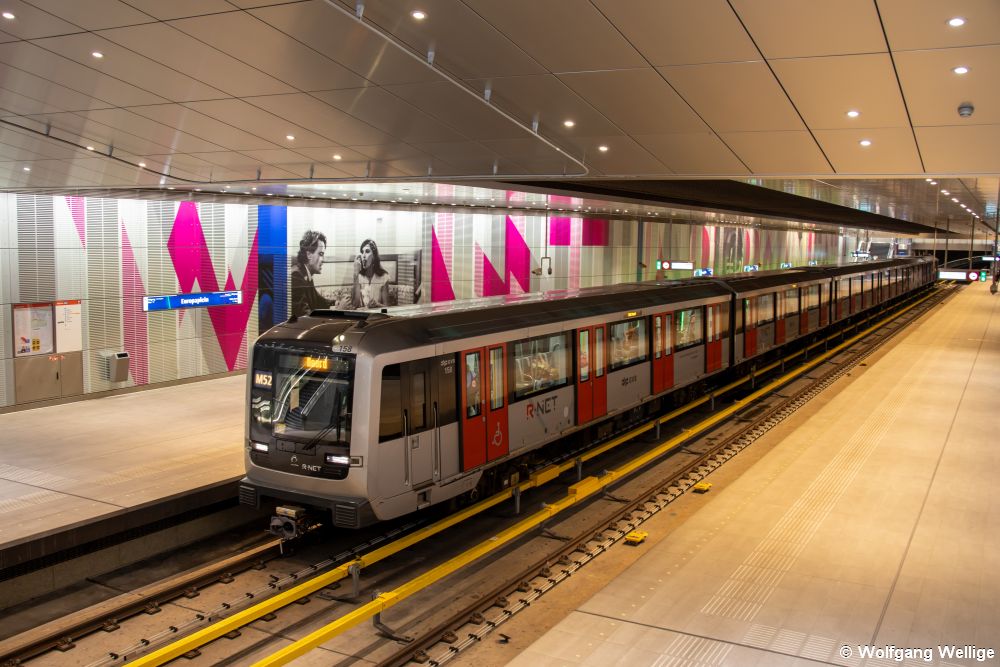 Auf der im Jahre 2018 eröffneten Nord-Süd-Linie M52, die unter anderem die historische Innenstadt erschließt, fährt Wagen 158 am 17.06.2021 in die Station Europaplein ein.