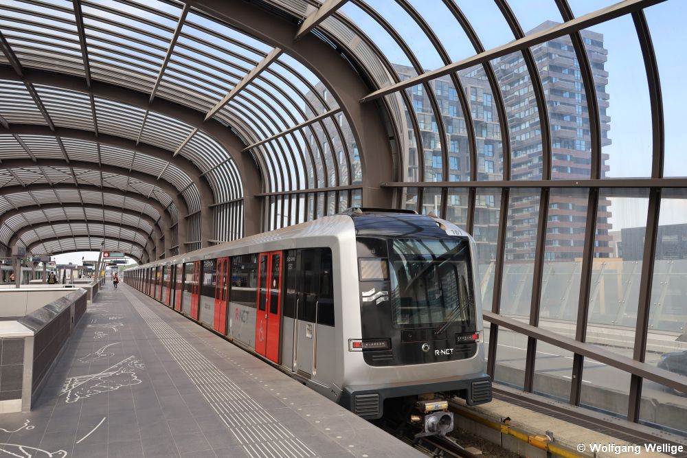 Metro-Wagen 161 hat am 17.06.2021 gerade die mit einer aufwändigen Halle versehene Endstation 'Noord' der Linie M52 erreicht
