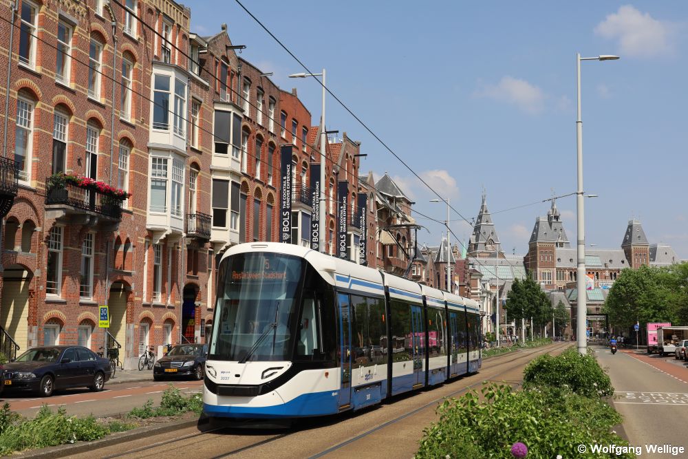Seit 2020 sind in Amsterdam 'Urbos 100'-Straßenbahnen des spanischen Herstellers CAF im Einsatz. Am 17.06.2021 fährt Wagen 3037 auf die Haltestelle Museumplein zu, im Hintergrund ist das berühmte Rijksmuseum zu sehen, das zahlreiche Kunstschätze beherbergt.