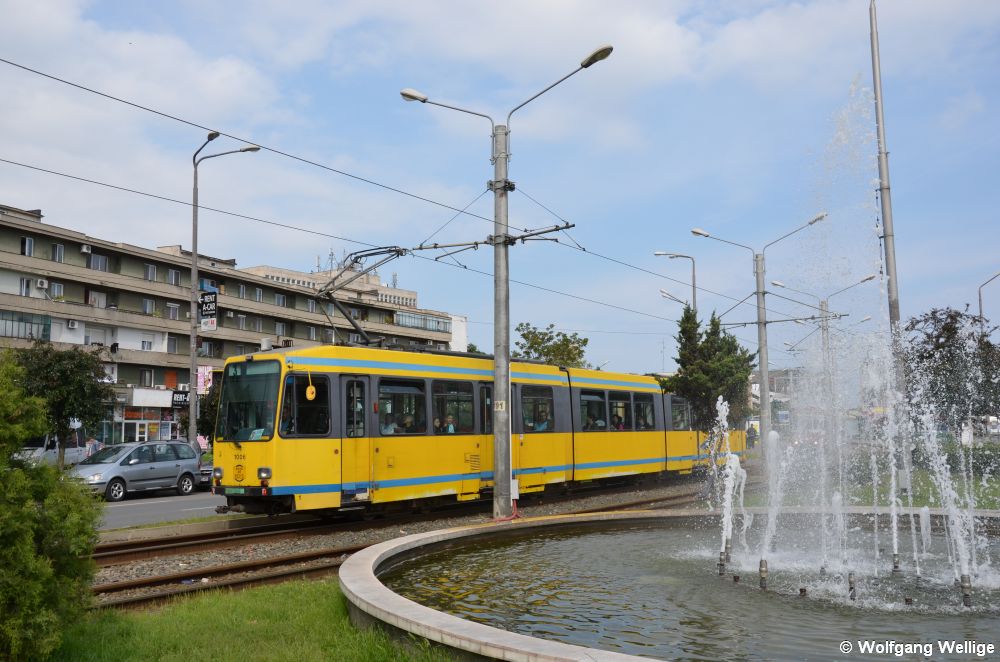 Der Düwag-Stadtbahnwagen Typ M8S Nummer 1006 kam von der Essener Verkehrs-AG nach Arad. Am 3. Mai 2014 fährt er als Linie 3 am Springbrunnen kurz hinter der Haltestelle Gara CFR vorbei.