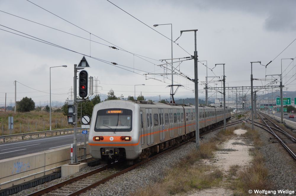 Alle 30 Minuten verkehrt eine Metro bis zum etwa 20 Kilometer von der Stadt enfernten Flughafen: Sie wechselt hierfür hinter der Station Doukissis Plakentias auf das Netz der griechischen Staatsbahn (OSE). Für diese Fahrten wurden sieben Zweisystem-Züge beschafft, die zusätzliche Dachstromabnehmer haben und mit 25 kV Wechselspannung betrieben werden können. Das Foto zeigt Zug 32 am 25.01.2016 kurz vor der auf dem Eisenbahnabschnitt gelegenen Station Peania-Kantza (Παιανία-Κάντζα).