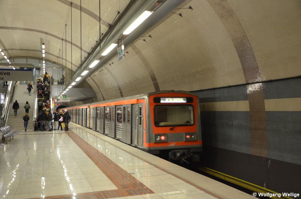 Metro-Zug Nummer 11, der bei 'Hellenic Shipyards' als MAN-Lizenzbau gefertigt wurde, verlässt am 23.01.2016 als Linie 3 die Station Egaleo (Αιγάλεω) Richtung Aghia Marina.