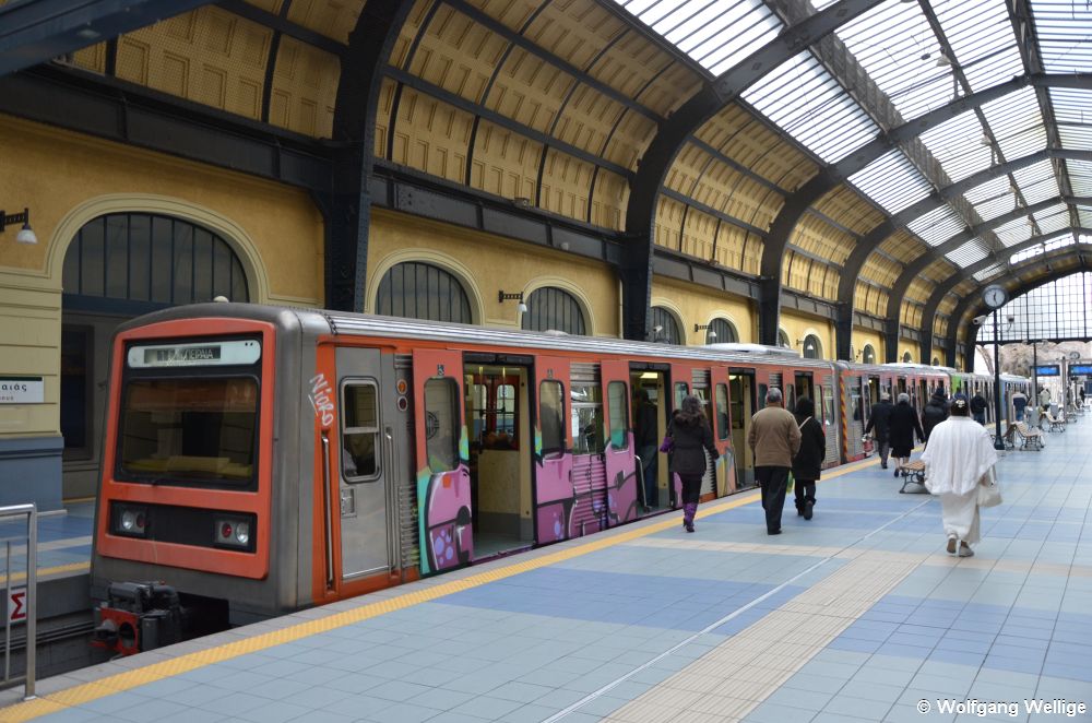 Antike Bauten oder Überreste davon finden sich zahlreich in Athen. Zwischen den Stationen Monastiraki (Μοναστηράκι) und Thissio (Θησείο) fährt die Metro sogar direkt daran vorbei: Am 23.01.2016 passiert Wagen 3153 als Linie 1 nach Piräus diesen Abschnitt.