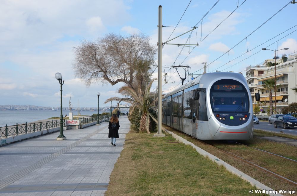 An mehreren Stellen fährt die Tram direkt an der Mittelmeerküste entlang, zum Beispiel zwischen den Haltestellen Batis (ΜΠΑΤΗΣ) und Flisvos (ΦΛΟΙΣΒΟΣ). Am 23. Januar 2016 befährt Wagen Nummer 10012 diesen Streckenabschnitt.
