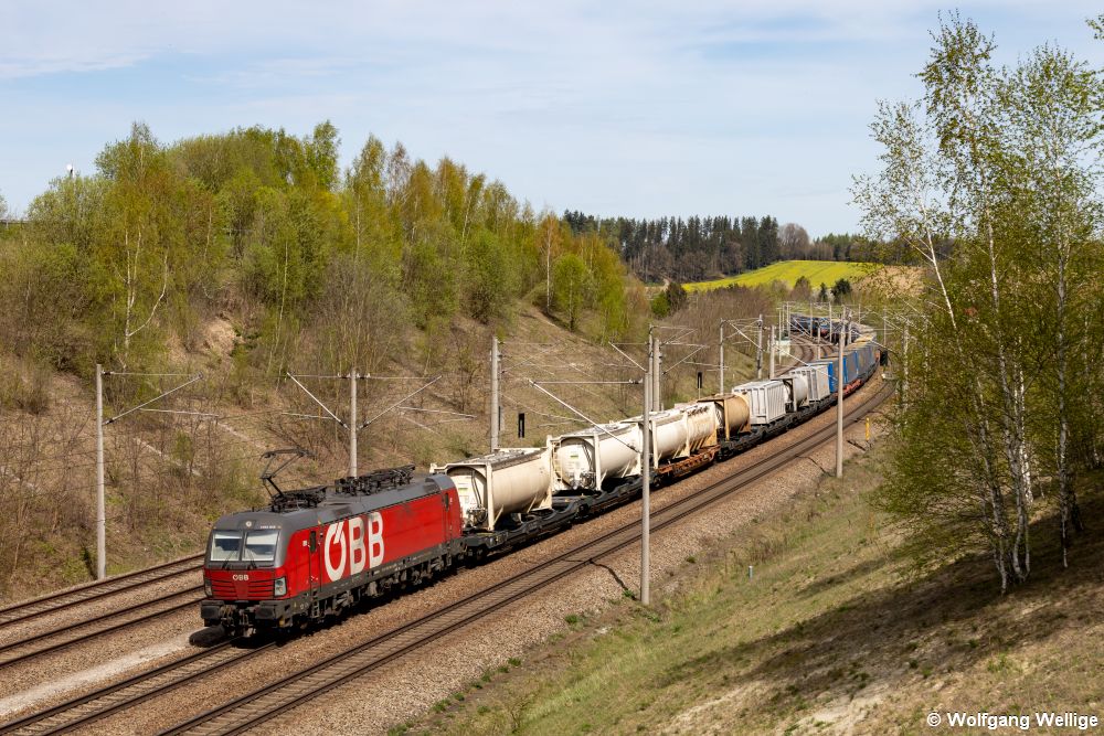 ÖBB-Vectron 1293 033 passiert am 19. April 2024 den Einschnitt bei Hebertshausen an der Strecke von Ingolstadt nach München