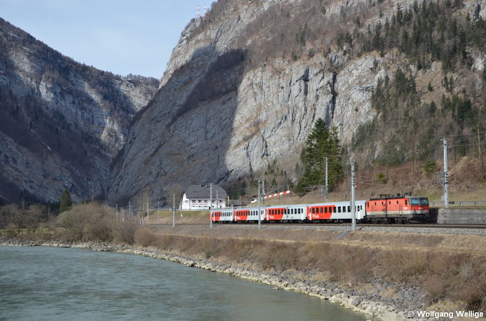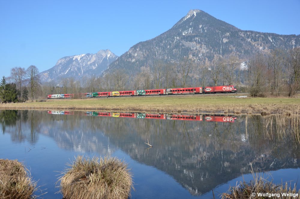 Gelegentlich kommt auch schon mal eine Lok im 'normalen' ÖBB-Rot an einem Railjet zum Einsatz. Am 25. März 2024 bespannt 1116 050 den RJX 864 von Wien nach Bregenz, die Aufnahme entstand bei Bernau am Chiemsee.