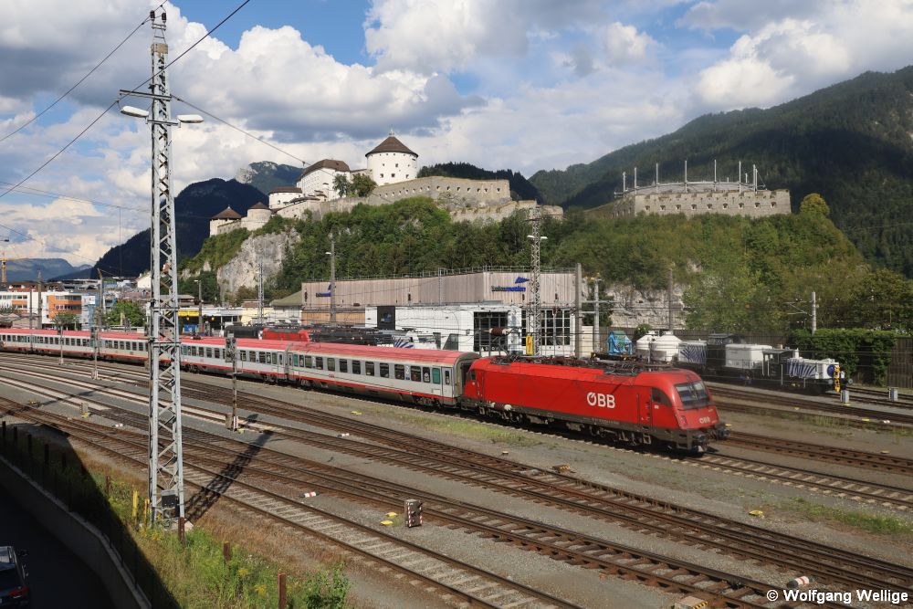 1216 023 der ÖBB verlässt am 12. August 2022 gerade Kufstein mit seiner weithin sichtbaren Festung, im Hintergrund abgestellte Loks des privaten Güterzugbetreibers Lokomotion zu sehen.