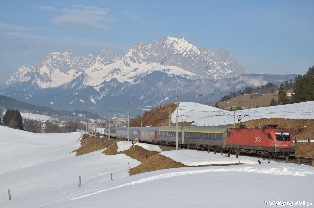 Holländische Skitouristen bringt 1116 098 mit dem aus niederländischem Wagenmaterial bestehenden D 13813 'AlpenExpress' von Amsterdam nach Zell am See, aufgenommen nahe Fieberbrunn mit dem Kaisergebirge im Hintergrund. (21.02.2015)