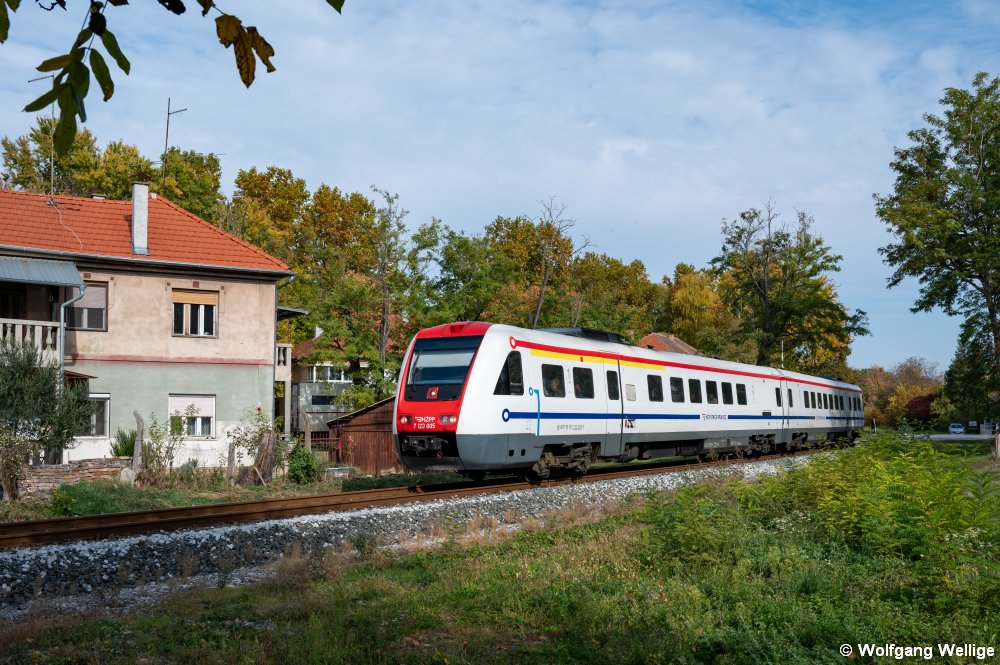 Dieseltriebzug 7123 005 , der identisch mit der Baureihe 612 der Deutschen Bahn ist, rollt am 20.10.2025 als R 6209 von Beli Manastir nach Osijek kurz hinter dem Haltepunkt Osijek Dravski Most durch die Hinterhöfe der Stadt Osijek