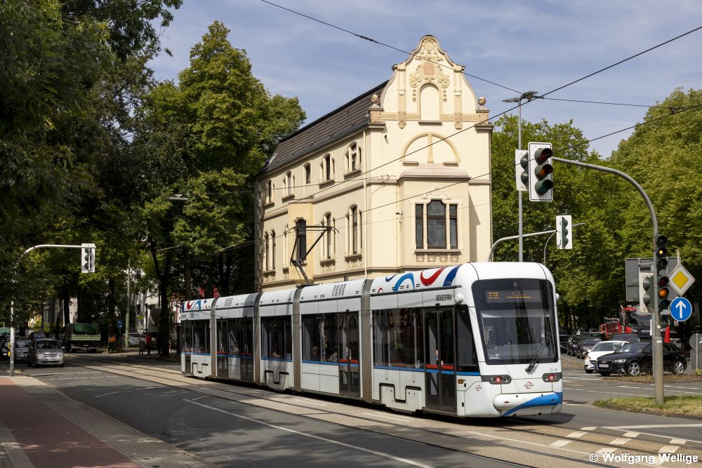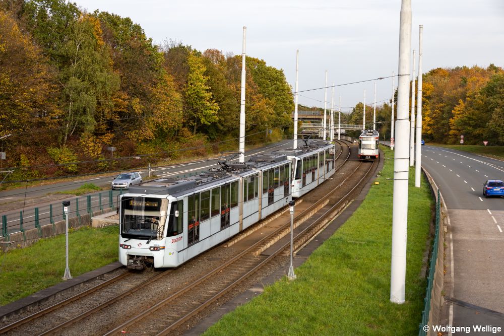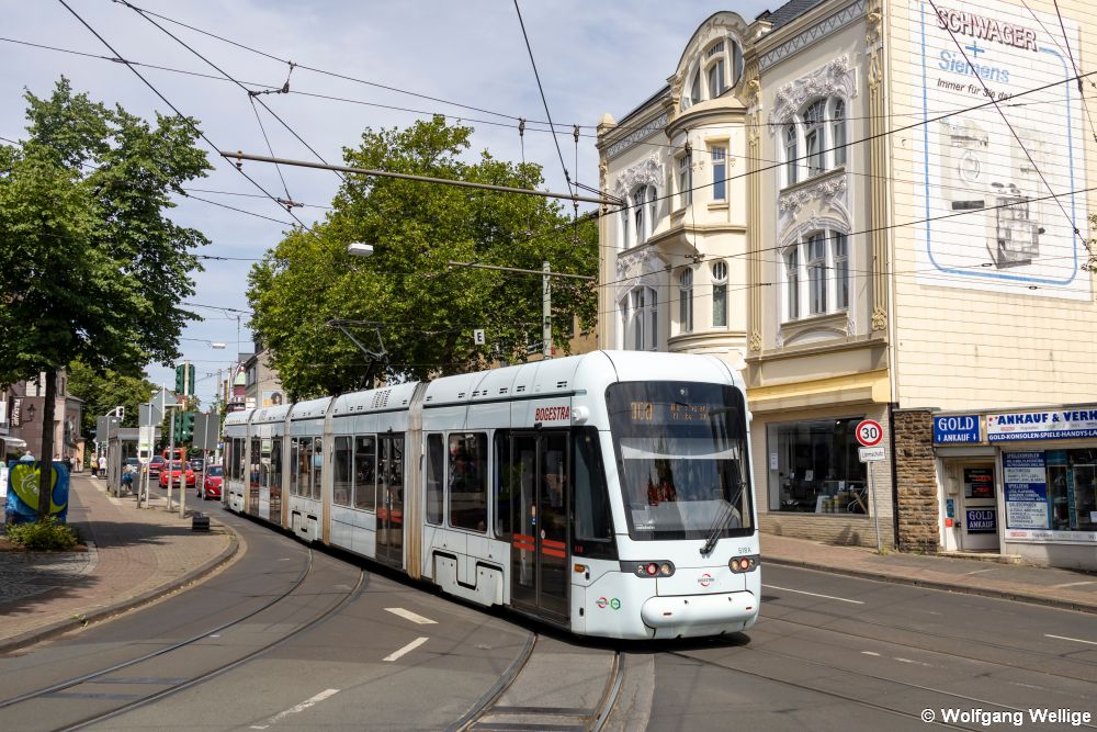 Seit 2021 ist der meterspurige Straßenbahnbetrieb in Bochum und Gelsenkirchen fest in der Hand der von 2008 bis 2022 produzierten Variobahnen des Herstellers Stadler. Am 28.07.2022 ist Wagen 121 kurz hinter der Haltestelle 'Schlosspark - Museum unter Tage' als Linie 308 auf dem Weg nach Gerthe.