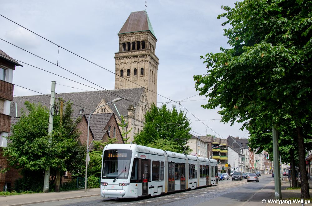 Variobahn 501 hat am 17. Juli 2013 als Linie 301 nach Gelsenkirchen-Horst gerade die Haltestelle Zeche Hugo verlassen
