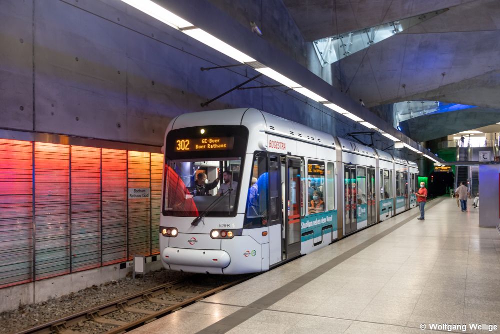 Wagen 519 hält am 28.07.2022 als Linie 302 nach Gelsenkirchen-Buer in der Tunnelstation Bochum Rathaus (Süd). Die Farbe der Wandbeleuchtung hinter der Bahn wechselt laufend.