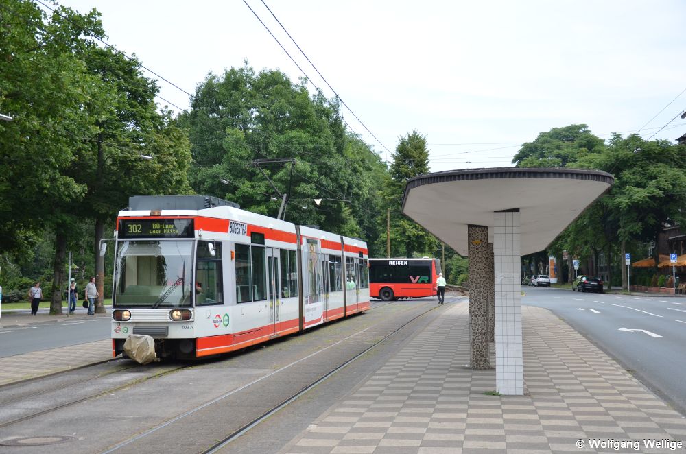Mittlerweile ausgemustert ist die erste Generation Niederflurfahrzeuge von Düwag. Am 17. Juli 2013 wartet Wagen 409 noch seine Wendezeit in Gelsenkirchen Buer Rathaus zur Rückfahrt nach Bochum ab.