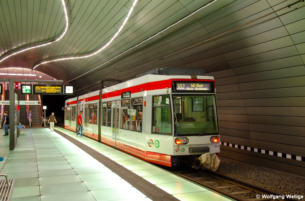Wagen 409 hält am 17. Juli 2013 in der unterirdischen Haltestelle Lohring, in der der beleuchtete Glasfußboden besondere Akzente setzt.