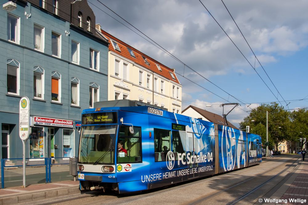 Der mit einer Ganzreklame für den Fußballverein FC Schalke 04 versehene NGT6D Nummer 421 fährt am 25. September 2009 in die Haltestelle Altenbochum Kirche ein