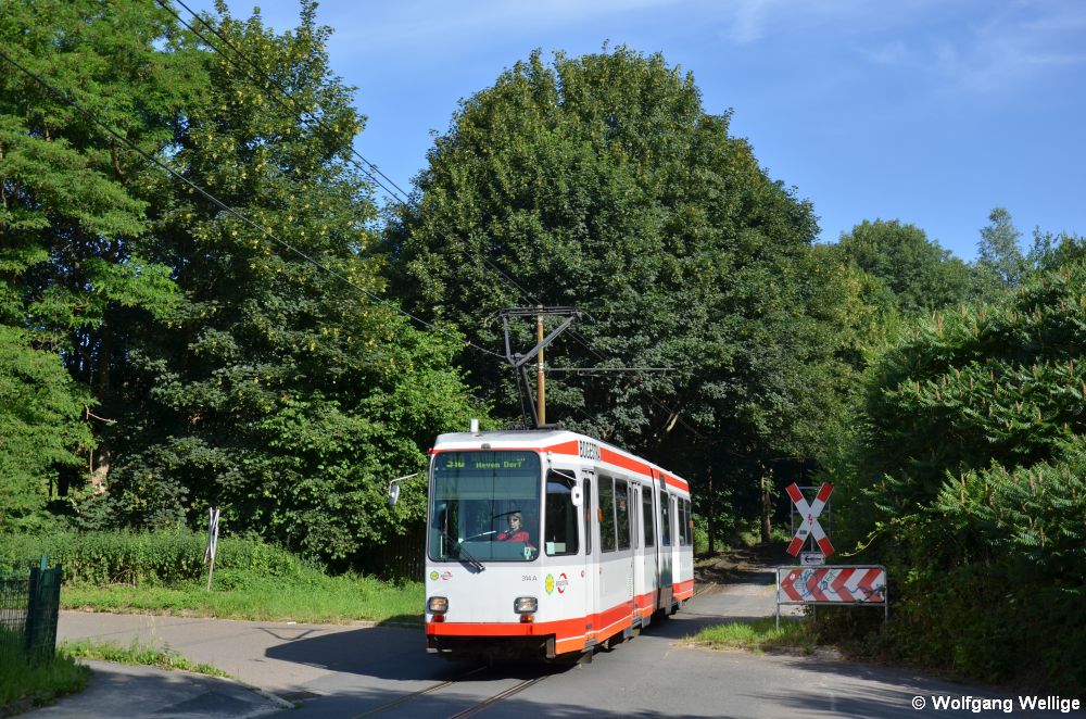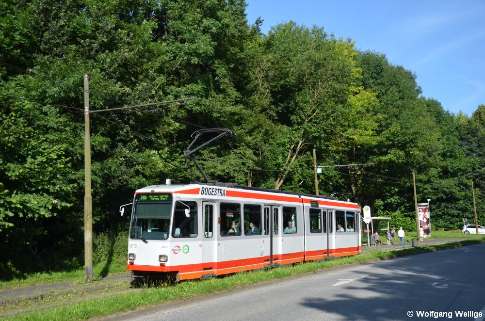 Auf der eingleisigen Überlandstrecke der Linie 310 nach Witten erreicht der 1976 gebaute und 2021 ausgemusterte Düwag M6S Nummer 314 am 18.07.2013 gleich die Haltestelle Papenholz