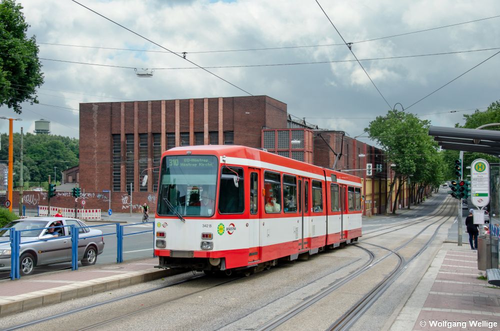 Der noch in der ursprünglichen Standardlackierung rot-weiß lackierte M6 Nummer 342 fährt am 17. Juli 2013 in die Haltestelle Wattenscheider Straße ein