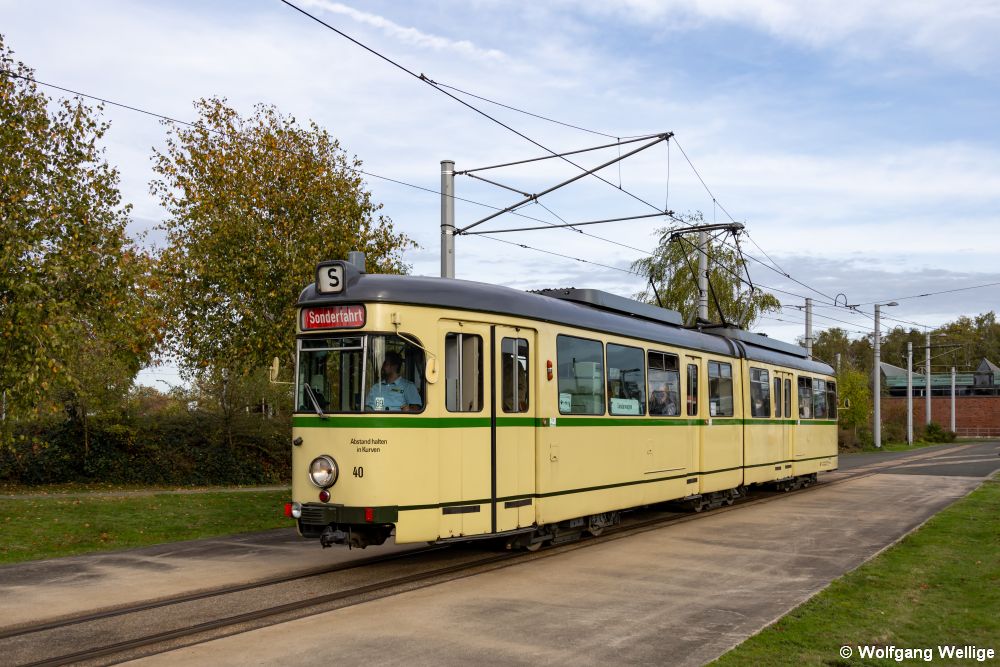 Das Düwag GT6-Museumsfahrzeug 40 aus dem Jahre 1968 rangiert am 27.10.2022 im Betriebshof Engelsburg
