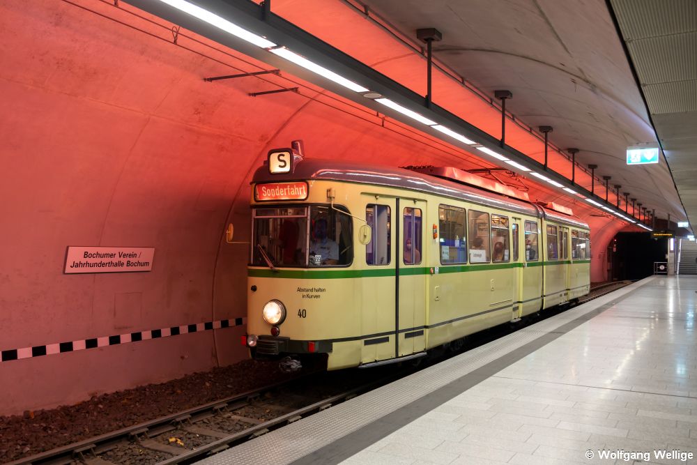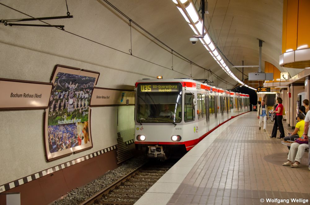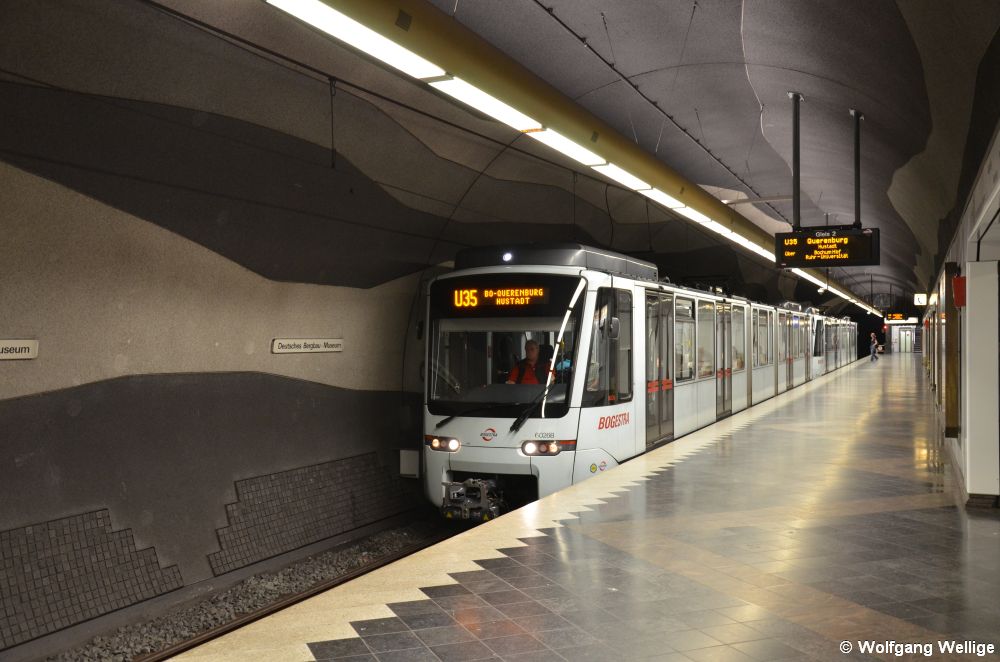 Für die Linie U35 wurden ab dem Jahre 2008 Fahrzeuge des Typs Tango des Herstellers Stadler beschafft. Eines von ihnen ist Wagen 6026, aufgenommen am 17. Juli 2013 in der unterirdischen Haltestelle Deutsches Bergbau-Museum, deren Gestaltung an einen Stollen in einer Zeche erinnern soll.